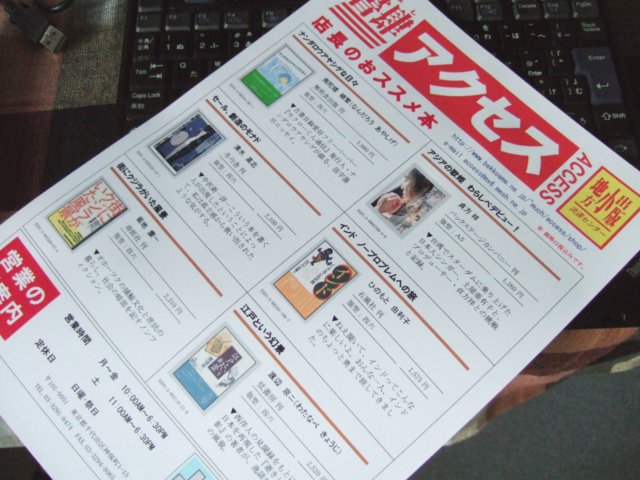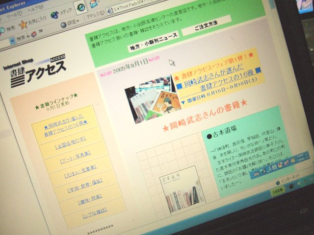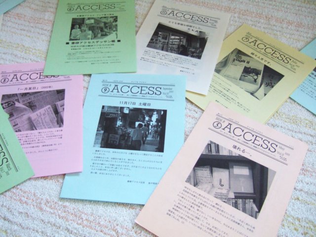 2003年、再び「書肆アクセス」のホームページに関わることになる。 コンピュータシステムの担当者として、地方・小出版流通センターに中途で入社してきた方から、「アクセス」のホームページを使って、インターネット書店(オンライン書店)を始めたらどうかと話を持ちかけられたのだ。 2000年を境(さかい)に、大型のオンライン書店がつぎつぎと開設し、検索エンジン『Google』(日本語版)が急速に発達していった。 自宅のパソコンで欲しい書籍を『Google』で検索すれば、オンライン書店のサイト名がつぎつぎに表示され、クリックひとつで注文できる環境がこのころには整いつつあった。 話を持ちかけた方が、どこまで本気でオンライン書店をやろうとしていたのかはいまとなっては判らないが、(リアル書店としての)「アクセス」はそろそろ危ないんじゃないかと、感じていたことだけは確かだった。 すでに1990年代後半から、書店や出版業界の状況は目まぐるしく変化していた。 出版不況、書店の大型化、「神田村」(神保町)の衰退、オンライン書店の台頭。 「書肆アクセス」も、この波に飲み込まれていく。 売り上げが伸び悩み、経営状態はこの年あたりから目に見えて悪化していった。 ◆◆◆◆◆ 2003年10月、「書肆アクセス」のホームページをリニューアルする。 「店長のオススメ本!」として、6冊の新刊を写真入りで紹介するトップページに変更し、ジャンル別に新刊案内を紹介する「書籍ラインナップ」のコーナーを新たに追加けた。 トップページのデータを活用した店頭用のポスター(A4サイズ)も、リニューアルと同時に再開する。 何度かホームページを更新していくうちに、気になる点が見つかった。 開設当初と変わらず、「書肆アクセス」のホームページは、地方・小出版流通センターのウェブサイト内にあり、地方・小から委託を受けた編集制作事務所がサイトの管理をしていた。 作成したホームページのデータを、いったんその事務所へ転送し、事務所側がホームページを更新するという手順を踏んでいたので、こちらから直接、「アクセス」のホームページを更新できなかった。 そのため、ホームページの更新やフォーマットを変更するときに、何度かトラブルに見舞われたのだ。 (使用しているパソコン(Win・Mac)や、ホームページ作成ソフトの違いによるものと思われる) また、リアルタイムに更新できないことも、のちのち新刊を紹介していくときのネックになっていくだろうと思っていた。 ◆◆◆◆◆ そこで2004年3月、「書肆アクセス」のブログ『書肆アクセス半畳日録』を開始する。 畠中店長と「書肆アクセス」のスタッフが、随時、ブログ上に新刊案内を書き込んでいき、ブログの更新データを活用しながら、私が「アクセス」のホームページを定期的(月2回)に更新するという製作体制がこの時点でできあがった。 以後、この体制のまま、ホームページとブログは「書肆アクセス」の閉店まで続けられていく。 じつは、ブログを始めた理由はもうひとつあった。 畠中店長とスタッフによる、「書肆アクセス」の「日記」を、どうしてもブログ上で再開してもらいたかったのだ。 リニューアルしたホームページは、オンライン書店を意識した作りで、本屋まで足を運ばずに「インターネット上」で本を買っていく人たちをターゲットにしていた。 ともすれば、「書肆アクセス」という本屋の存在を、私はないがしろにしていたことになる。 畠中店長はむしろ、神保町まで足を運んで「書肆アクセス」へ本を買いに来る人たちを増やそうと考えていた。 神田神保町に店を構える、「書肆アクセス」という本屋の店長としての、あたりまえの仕事をおこなおうとしていたのである。 「書肆アクセス」のほんとうの魅力は、畠中店長とスタッフたちが醸(かも)し出す、あたたかな店の雰囲気にあった。 せまいけれど、人と人とのぬくもりが感じられる、とても素敵な本屋だということを、できるだけ多くの人たちに知ってもらうためには、「書肆アクセス」で働らく畠中店長やスタッフたちの「日記」が必要だった。 ◆◆◆◆◆ 2004年5月、「書肆アクセス」の店舗や店内を撮影した写真を、ホームページ上に掲載し始める。 ブログ上で「日記」とあわせて写真を貼っていけたらと思っていたのだが、当時の「アクセス」にはデジカメやスキャナなどの機材もなく、畠中店長やスタッフたちもまだ、ブログの操作に不慣れだったため、「書肆アクセス」のホームページ上に写真を載せていくことにした。 ホームページ製作の兼ね合いから、撮影は私がおこなうことになる。 写真をクリックすると、ブログ『書肆アクセス半畳日録』へリンクするようになっていた。 ◆◆◆◆◆ 2004年9月、フリーペーパー『SIDE B アクセス』を発行する。 ホームページやポスター、ブログのデータを活用して、何か別のこともやろうとしていてたときにふと思いついたのが、96年にパイロット版を製作した『SIDE B アクセス