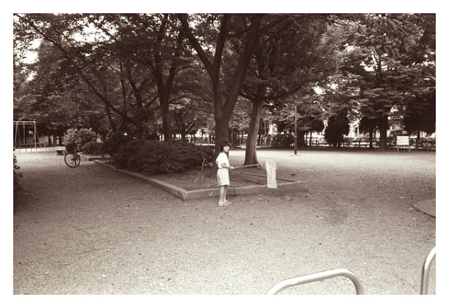 ![]() ![]() 『それがいつのことだったのか思い出せない。 3』 撮影機材:OLYMPUS μ-U フィルム:FUJIFILM ネオパン400PRESTO 2003年8月頃 ? フィルム(銀塩)カメラを手にしての撮影は、どこか昆虫採集をしている感覚に似ている。 周囲の状況をじっくりと見渡し(光学ファインダーで構図を確かめ)ながら昆虫に近づいていき、タイミングを見計らって虫取り網(捕虫網)で捕まえる(シャッターを切る)。 最終的に標本(プリント)として保管するため、捕まえた昆虫(現像したネガやポジ)はできるだけ損傷が少ない状態が望ましい。 それゆえに昆虫を網で捕まえるチャンスは限られてくる。 (フィルムを入れて1回に撮影できる枚数(1枚から36枚(ハーフサイズだと72枚)が限られる。フィルム交換の際にシャッターチャンスを逃す可能性もある) 一方、デジタルカメラ(コンパクトデジカメやカメラ付き携帯電話)を手にしての撮影は、金魚すくいをしている感覚に近い。 水槽(液晶画面)のなかで泳いでいる金魚を、ポイ(金魚をすくう道具)で追いかけながら、ここぞというタイミングですくい上げる(シャッターを切る)。 たとえすくい損ねて(撮影に失敗して)も、ポイを新しいものに交換(撮影した画像を消去)すればいいし、自分が持って帰られる範囲(記憶メディアのデータ容量まで)ならば、何匹でも金魚をすくう(撮影する)ことができる。 すくい上げた金魚(撮影した画像データ)は、金魚鉢や水槽(デジカメや携帯電話、パソコンなどの画面上)のなかで泳がせて観賞する。 (水が悪かったり、鉢が割れて水が流れ出す(ハードディスクやメモリーカードがクラッシュする)と、金魚(画像データ)は死んでしまう) コンパクトタイプのデジタルカメラは、コントラスト検出方式というAF(オートフォーカス)が使われている。 レンズから入ってきた光のコントラストをCCDで測るしくみ(ピンボケ=コントラストが低い? ピント合焦=コントラストが高い?)で、撮像(撮影)用CCDをそのまま流用できることから、コストの面でもサイズの面でもメリットがある反面、ピント合わせに時間がかかる。 私の使っているコンパクトデジカメも同様で、カメラ背面の液晶画面を覗き込みながら、被写体にピントが合うのを待ち、シャッターを半押し(AFロック)した状態のまま、じょじょに構図を整えてシャッターを切るという、「金魚すくい」の撮影スタイルがすっかり体になじんでしまっている。 しかしながら、むかし撮影したフィルムを引っ張り出してこうして見ていると、「昆虫採集」の気分で一瞬をとらえるスナップ写真の撮影感覚がよみがえってきて、またいつか、こんなフットワークの軽い写真を撮ってみたいとも思ったりする。 コンパクトデジカメを使うようになってから、なかなか思うようにスナップ写真が撮れなくなってしまった。 とっさにピントが合わないコンパクトデジカメでの「金魚すくい」の撮影スタイルは、スナップ写真の撮影にはやはり不向きだ。 とくに被写体が街中(まちなか)の人物を撮影するときには、肝心(かんじん)なところでピントが合ってくれず、なかなか撮影のリズムがつかむことができない。 思うようにスナップ写真を撮れないのには、もうひとつ理由がある。 「肖像権」の問題である。 「肖像権」という言葉がクローズアップされていくのは、カメラ付き携帯電話が普及した2002年から2003年あたりからだった。 「デジタル万引き」などの撮影マナーの悪さ、「盗撮」などによる写真や映像の配信、そして中高生に多く見られる「いじめ」など、カメラ付き携帯電話(デジタルカメラやデジタルビデオカメラも含む)によってもたらされたさまざまな弊害(へいがい)は、いまだに深刻な問題として社会に重くのしかかっている。 カメラ付き携帯電話も、コンパクトデジカメとおなじように液晶画面を覗き込みながらの撮影スタイルだ。 そのため、こちらがコンパクトデジカメで撮影をしていると、あからさまに不快な表情をしたり、緊張した面持(おもも)ちですれ違ったりする人たちが多くなった。気軽に人に声を掛けて撮影する雰囲気もなくなりつつある。 (ギスギスした世の中であります) 撮影しているときはそれほど意識してるつもりはないのだけれど、コンパクトデジカメで撮影した最近の写真を見てみると、通り過ぎる人物やお店の看板、車のナンバープレートといった「肖像権」に触れそうなものに対して、私はあきらかに撮りづらそうにレンズを向けている。 まるで「肖像権」を避けるかのように(?)、近所の公園の木や川、神社ばかりが写っていた。 (撮り進めていくと、「悟り」が開けてくる?) 虫取り網やポイ(カメラ)をにぎりしめ、わくわくしながら昆虫採集や金魚すくいをしている(写真撮影をしている)人って、21世紀のこの時代、いったいどれくらいいるのだろう? |